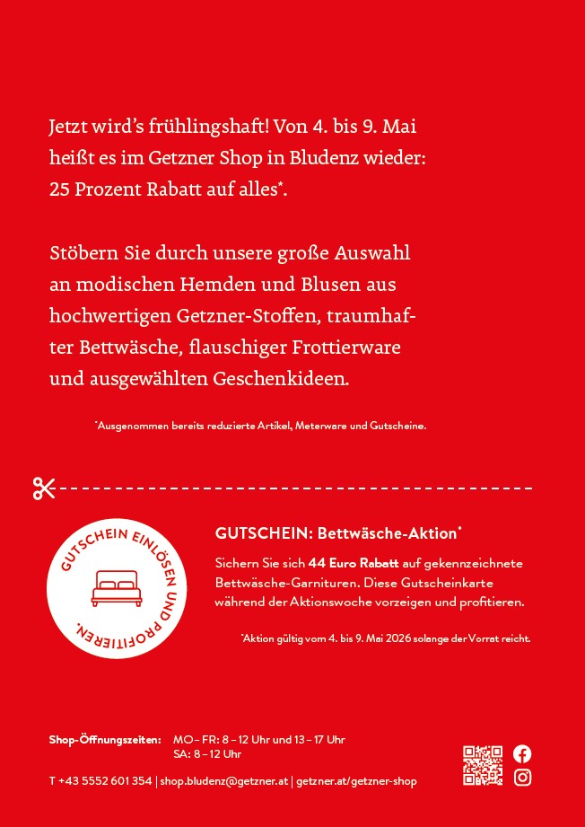 Von 4. bis 9. Mai heißt es im Getzner Shop in Bludenz wieder: 25 Prozent Rabatt auf alles (ausgenommen bereits reduzierte Artikel, Meterware und Gutscheine)